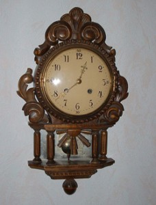 När mor och far gjorde investeringen i denna klenod i mitten av 50-talet gjordes det säkert en noggrann planering före införskaffandet av den. Alla vi kände hade antingen en bordspendyl uppe på någon tung mahognybyffé eller så hade man en guldpendyl hängande på väggen. Som jag förstått senare i livet var det inte mina föräldrars stil någon av dessa alternativ, men en klocka ville de ha. Det slutade med att man inköpte en väggpendyl med samma emaljurtavla som i de flesta väggpendyler, men själva fodralet var i mörkbetsat trä. Den inhandlades hos deras ”hovleverantör” Elgstrands Ur & Optik på S.Storgatan. Snyggt och framförallt modernt. Den hängdes på hedersplatsen ovanför byffén i storarummet. Jag minns också att mot senare delen av 50-talet smög mor bort farfar och farmors porträtt från byffén. Eftersom vi inte hade några porträtt på mormor och morfar ansåg jag detta var helt i sin ordning.