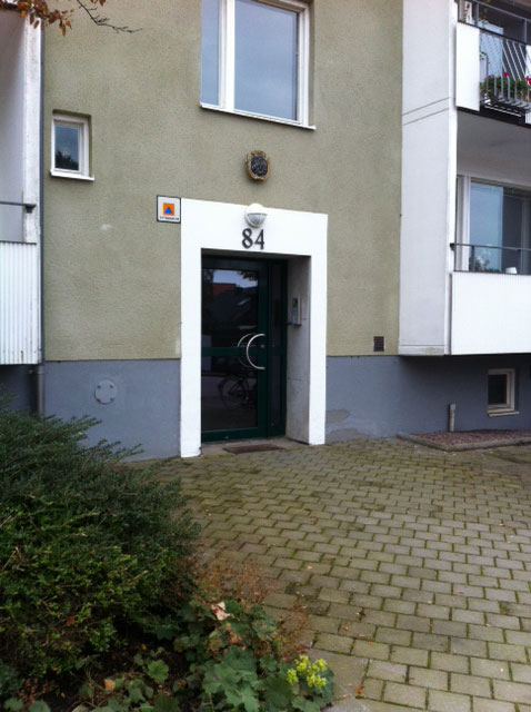 Sedan vi druckit kaffe färdigt gick jag ner över Backen in genom grinden in på gården. Då jag var barn var det gräsmatta på båda sidor om gången ner mot ”gården”. Idag var det stora uppväxta träd som gjorde ”gården” mörk och murrig. Stackars dem som bor i Brommessons och Bomans lägenheter. De kan inte ha så mycket dagsljus in i sina ”lillarum”. In i trappuppgången kom jag aldrig. Här var en porttelefon och de namn som jag läste var inte bekanta så jag fick nöja mig med att kika in. Men det såg ut som det alltid sett ut.