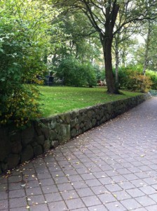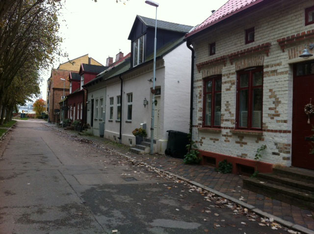 När vi kom ner på Norra Stenbocksgatan var det inte lika mycket ”himmavid” även om jag gått här många gånger. Jag gick inte den väg jag nyttjade då jag gick till skolan. Kanske jag borde tagit den vägen. Men när vi kom fram till Stampgatan gick vi den upp och tittade på nybyggnationerna som de håller på med inne på skolgården. Borta var den byggnad där jag började mina första år hos fröken Månsson. Uppe vid Hjalmar Forsbergsgatan gick vi in vid de engelska radhusen och in mellan dem. Där är radhus både vid Stampgatan och Pålsjögatan. Mellan dessa finns en smal gångstig. Detta förvånade maken som fick följa med på dessa irrfärder.