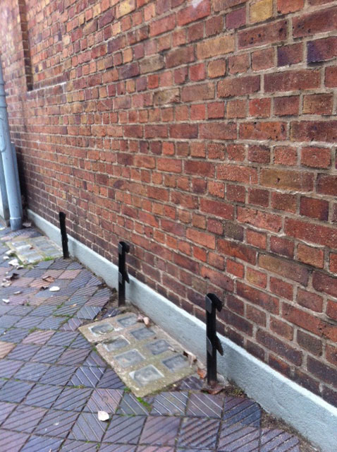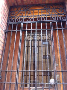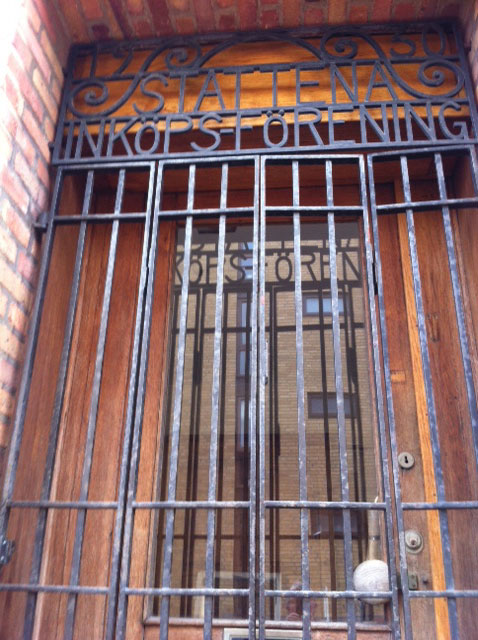 Tog ett foto på de fantastiska cykelställ som finns på gaveln till inköpsföreningen. Då jag var liten stod här alltid någon/några cyklar här. De var kundparkeringen. De som arbetade i affären ställde sina cyklar inne på gården. Tryckte näsan mot skyltfönsterna och konstaterade att här nu finns en antikvitetsaffär inrymd i gamla ”föreningens” lokaler. Tog en bild av den pampiga smidesgrinden vid ingången. Gör man sådana idag?