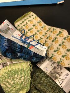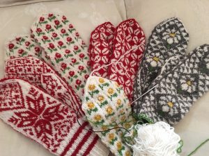Men strumpor och vantar har jag alltid kunnat lura på folk. En gång då var jag på en tillställning då jag visste att jag skulle träffa en som beställt ett par vantar. Tog med mig inneliggande lager. Så kunde hon själv välja. Detta skedde i juni månad så mina alster väckte lite uppmärksamhet,. Det var inte rätt i tiden tyckte folk som råkade se mitt lager, yllevantar och försommar. Min svärdotters far undrade skrattande om jag var ”resande i vantar”. Ha ha ha, visst var han kul….