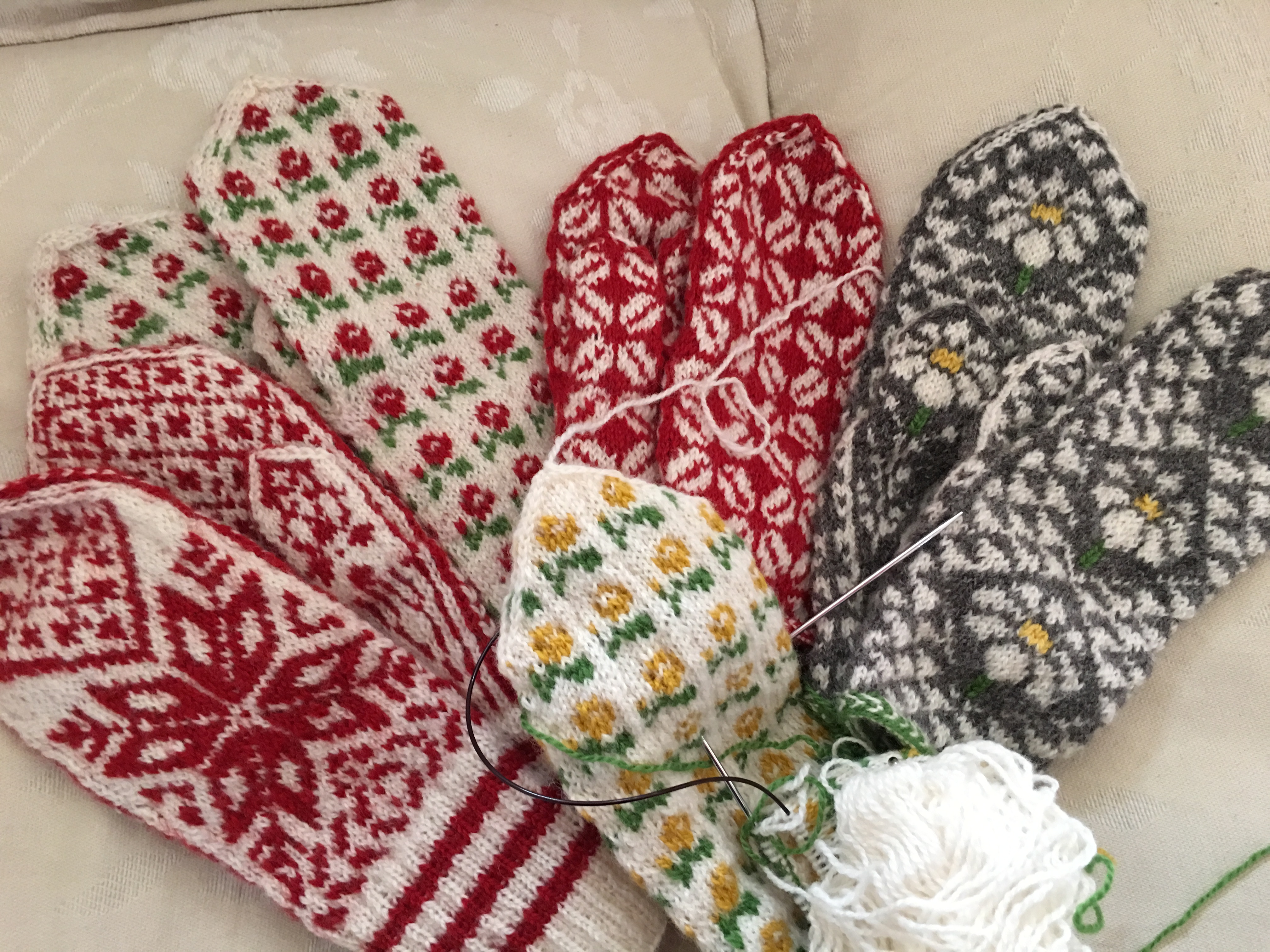 Sist jag skickade strumpor till dottern, slank det med ett par av mina fina ”skånevantar”, de som jag har stickat flest av. Med en prästkrage i mönstret har de fått namnet skånevantar. Dottern undrade vad hon skulle använda dem till. Tyckte de var för vackra att slita på. Jag svarade att om hon inte hade någon användning för vantar tog jag gärna tillbaka dem. Nu, denna sändningen slank det med ett par till, rosenvantar, så kanske hon törs slita på dem. Jag tycker det är så trevligt att sticka vantar….