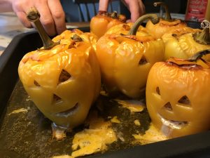 Maken är iväg för att komplettera middagsmaten. Hittade ett kul recept med paprikor, fyllda. Har lagat det några gånger under årens lopp. Dock är det troligen bara jag som gillat maträtten. Därför har det inte blivit en återkommande önskan om att vi ska laga det från övriga familjemedlemmar. Men för en vecka sedan fick jag ett tips från en bekant om att man skulle modellera paprikorna som små pumpor med utskurna munnar, näsa och ögon så de liknade halloween-pumpor. Kanske ett nytt sätt att locka till denna maträtt?
