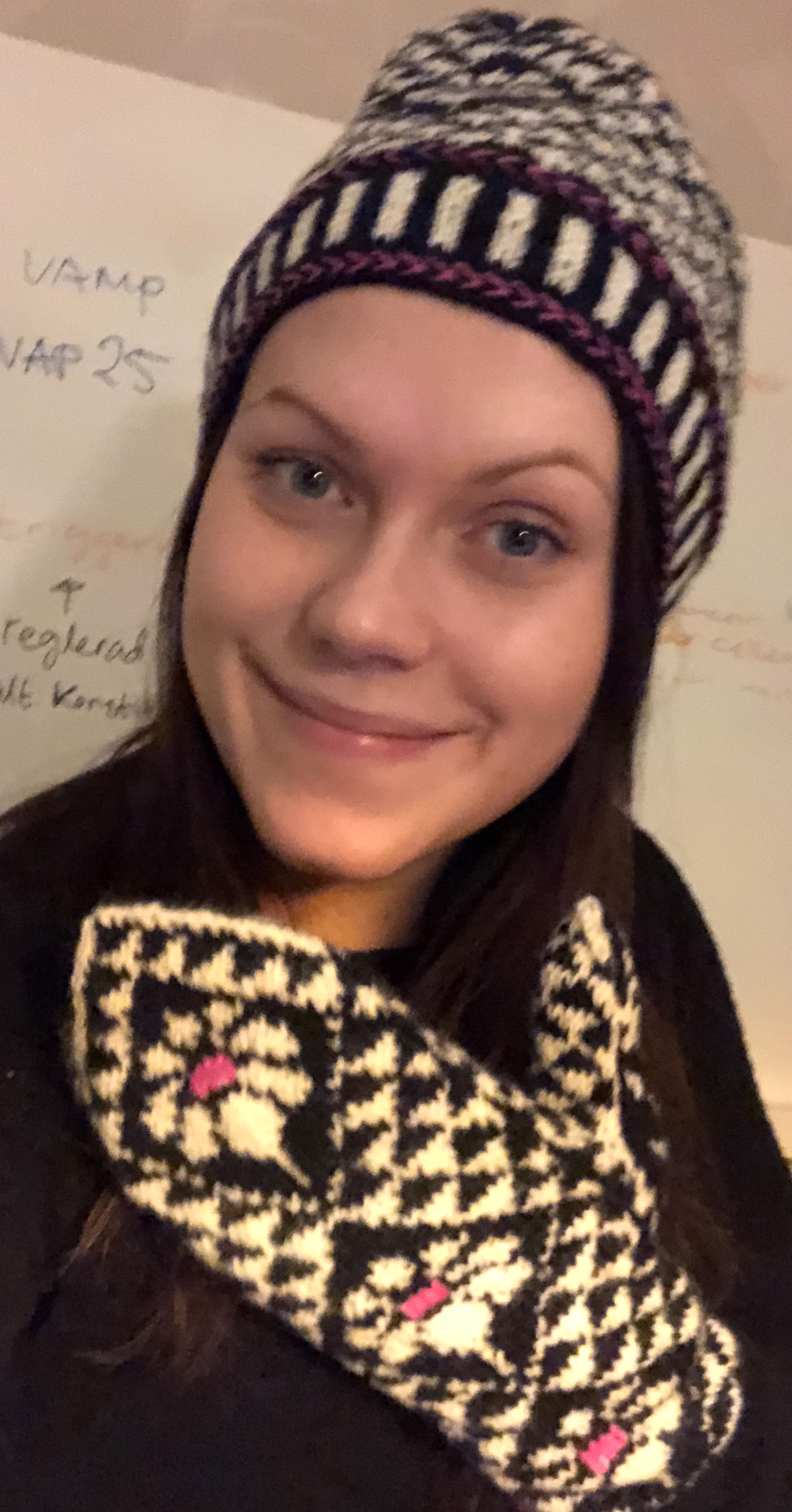 Oh, så fin…. Måste, måste… det slutade med att jag gick hem, färdigställde mitt eget vantpar, avslutade dem med den där fyrflätan som jag hinner glömma hur man gör början till….varje gång. Men nu, den där och mössan som gjordes i ett huj. Det var så oerhört roligt att jobba med mönster-stickning igen. Skickade iväg den till damen som fått ett par vantar med det mönster som är på mössan. De vantar hon ifrågasatte om man kunde använda, de var för vackra… det var mer än jag som förälskat sig i det mönstret tydligen. När mössan anlänt erkände hon att vantarna kommit till användning. Och uppskattats. När man skrapar is på bilrutan tidiga mornar är ett par go’a yllevantar inte fel, sa hon. Ok, nu räckte inspirationen till att ta tag i de där svarta som legat och morrat i bakhuvudet på mig. Och de blev faktiskt jättefina. Fick bli både vantar och mössa, jag tycker det är ett set, eller som det heter nuförtiden ett kit….