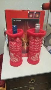 Då det gått ett par minuter fick jag ett MMS med ett par trevliga jul-presentförpackningar för vinflaskor. Jag tittade länge, såg att det var något stickat. Kommentaren som följde sa: skulle värma mina ben men efter en runda i maskin blev de vinvärmare!