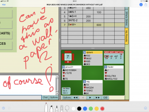 And now at last, i want you to tell those of you, who are like me almost a bridge maniac, at least a bridge addict, i will tell you what happened yesterday. Our opponents bid 1 heart and I wanted to tell my partner I had a great hand with seven nice spades ace, jack and five to them. I bid 3 spades to explain to my partner what my hand looked like. Opps bid 4 heart without any hesitating. I felt a bit disappointed, my nice spades… but my partner thought…..and thought…. and there i sat. Had he been disconnected again? He had dropped net some times last evenings… but NO!…now he bid, 4 NT and i was afraid he maybe had missunderstood me. I had not any strong hand, only my nice spades. There were 6 other cards i hadn’t shown him.