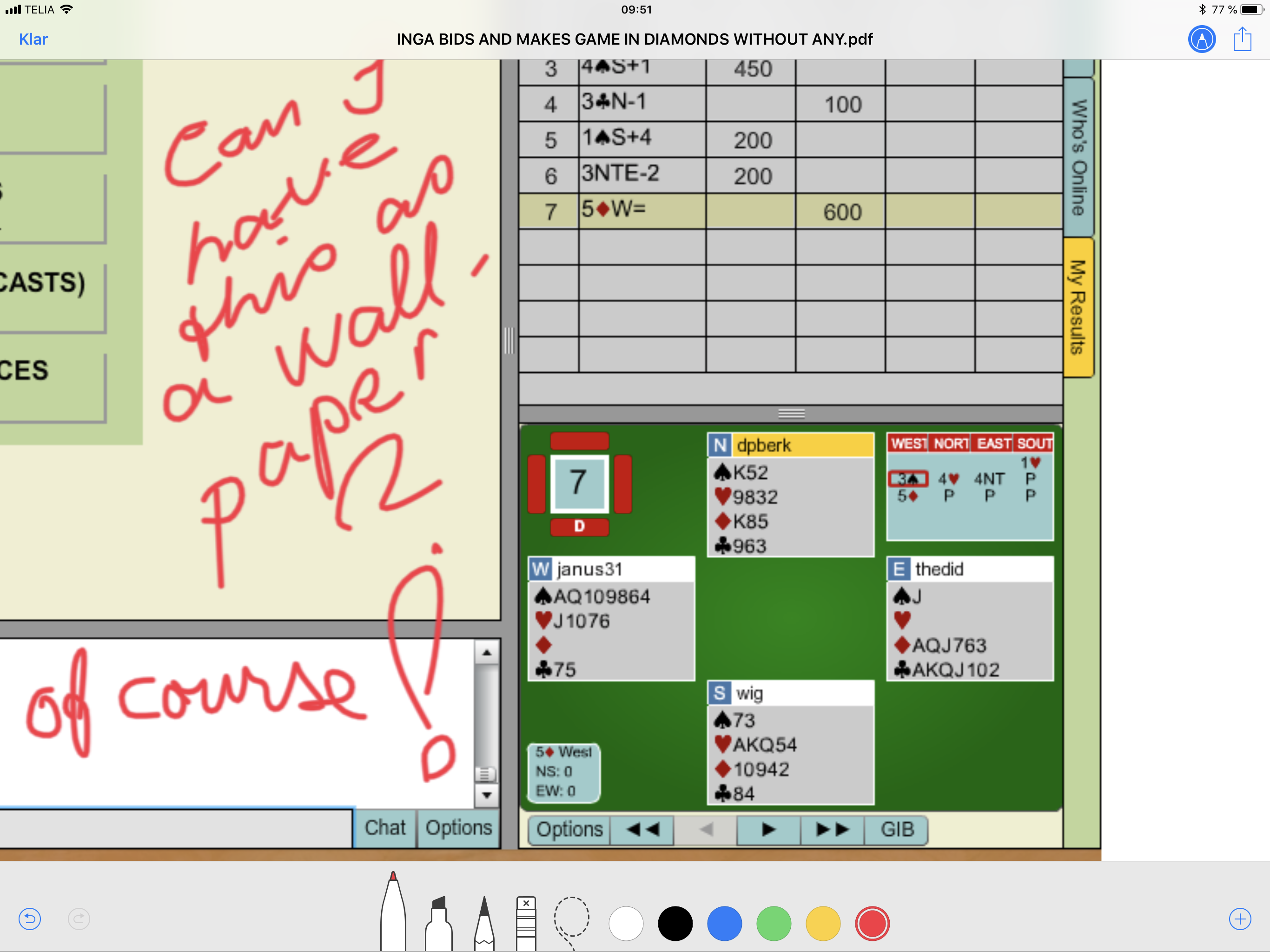 Opps didn’t double thanks God. And they lead a card, what card i dont remember. (It was a heart my partner told later). But i got the dummy at table. At first i was a bit sorry for my partner and his faux pas. We had eight spades together and only six diamonds. But he is maybe weak in his mathematic… and he maybe will learn… now i had to make a plan how to play those cards. I counted and played……counted and played…..and once when i once more counted my remaining spades i happened to play a card, not according to my plan, it just escaped away when i touched it… oh help… i had to sacrify one of my expensive diamonds in dummy…. and opps at my right overtrumped. Make a new plan and try to get so few bet as possible. But they got two trick, remaníning trick was mine!! How? Don’t ask me, i really don’t know what happened. But comments from both opponents and my partner told me i made it…. and as my partner said afterwards: some contracts i will remember as long as i can remember… i hope i may enjoy this feeling for some weeks….month and maybe even years…