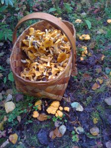 lilla barnryggsäck som vi gjort till henne. Som ”värdinnegåva” bar hon på en påse kantareller. Jag blev glad för redan då hade jag en tydlig värk i benen efter min skogspromenaden dagen före. Makens syster kom också på en tallrik mat. Och alla pratar om rikedomen som växer runt omkring oss, detta skogens guld. Mycket vill ha mer, sa mina föräldrar om detta fenomen att man aldrig blir nöjd. Jag hade fått lite älgkött som jag lagade en god gulasch på. Så nu gapar skafferiet tomt på lök och paprika.