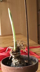 Detta utspelade sig i onsdags, som är vår ordinarie blomvattnardag. Idag kom han bärande med en kruka från just – röda rummet! Jag började min protest men svalde orden i samma ögonblick krukan kom närmre. En blek stängel med en blomknopp på gång hade utvecklats ur den ”döa löken”. På fyra futtiga dagar har denna blomma satt knopp. Den som normalt brukar blomma vid påsktid. Denna gammaldags blomma som INTE finns att köpa i någon affär! Hade den känt sig hotad? Vet den inte att den är en av mina skyddslingar? Denna Äkta makar-blomman. En sådan som man delar med sig av till vänner och bekanta. Men att uppbringa i en affär….finns inte!!!