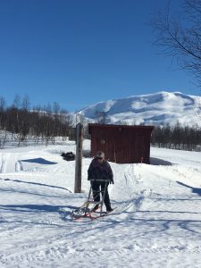 Nu denna vinter har föret varit sådant att en sparkstötting har varit till god hjälp. De dagar då det varit lössnö som man trampar igenom, har sparkar’n varit till god hjälp. Man har inte trampat så djupt, innan man har flyttat över tyngden på sparkstyret. Och kängorna har både suttit kvar på fötterna och följt med i nästa steg. De dagar det varit kallt och stigarna blivit glashala har sparkar’n fungerat som en rollator. Både balanshjälp och som stöd i halkan. Att det sen varit jätteskojigt att gå på dass ger även det ett mervärde. Efter uträttat ärende kliver jag ut, vänder sparkar’n och stiger upp med en fot på en av de där ”stå-krumelurerna” som är fastsatta på medarna. Ett litet spark med foten och i ett huj är jag tillbaka vid stugan. Inga rovor på den hala gångvägen.