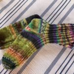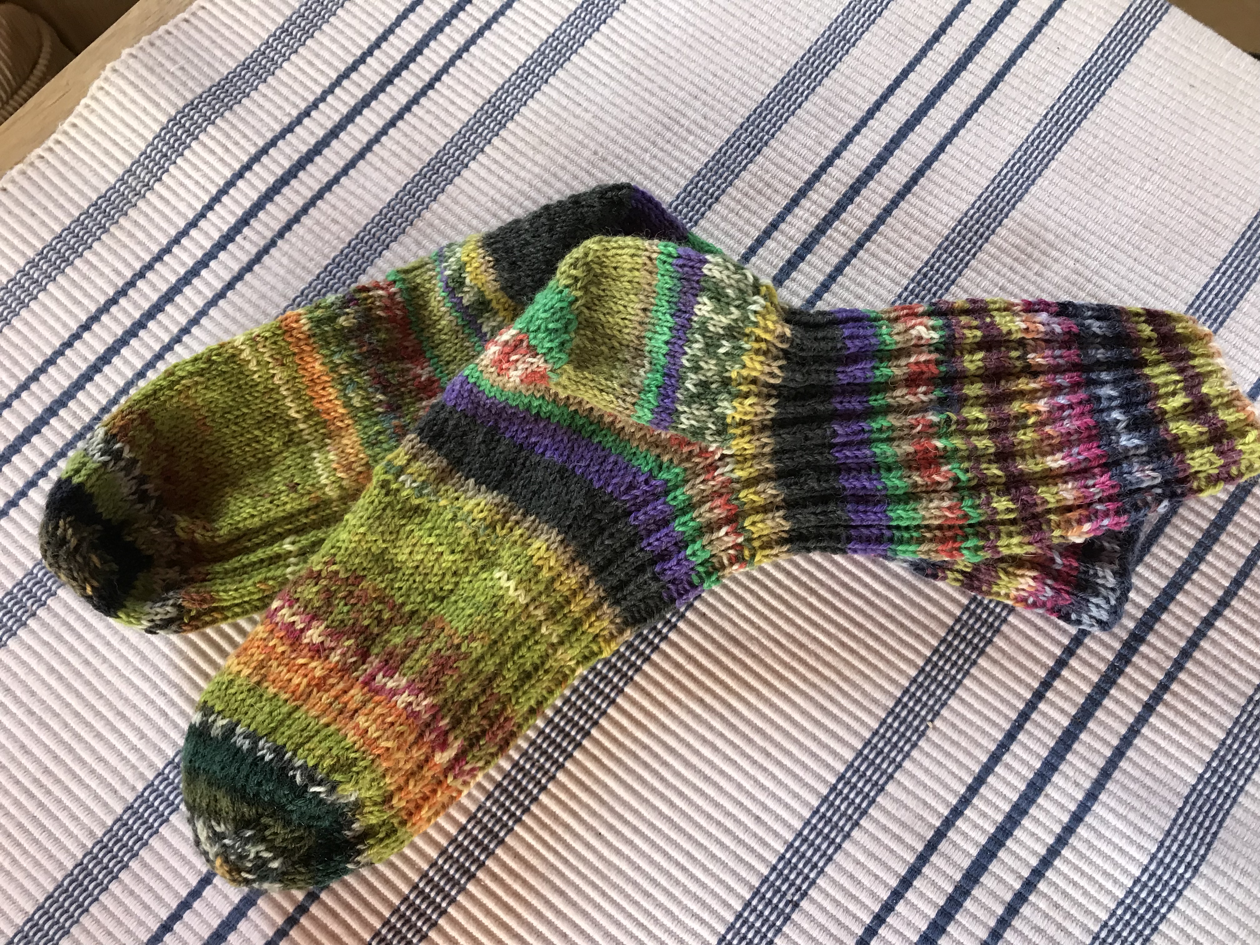 Jag blev glad då jag stickade dem. De spritter av livs- och stick-glädje med sina många färger. Vill ni se dem innan hon eventuellt stoppar dem djupt ner i stövelskaften?