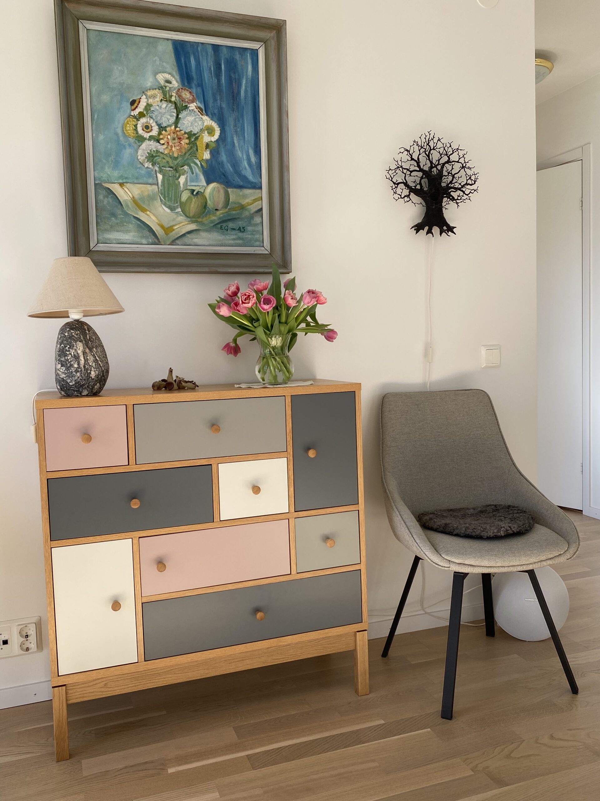 In middle of 70s my parents waited for their apartment to become repaired, and they had decide to get rid of some old furnishings. They asked my husband for help carrying some stuff to the container for trash. And I saw Erik’s painting was once more devalued. To an even lower degrade then last time. Whispering I asked my husband to put it in our car instead of the dustbin! The painting and an old chest of drawers, as in my memory we had repainted more than once, and changed handle to look more up to date. Sighing he obeyed and we hide those stolen goods from my parents eyesight.
