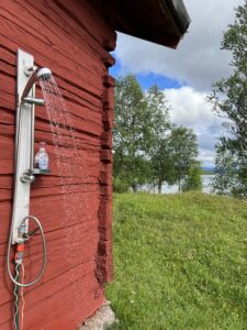 I stand there and think of rest of Europe, the heat torment our whole world, many big areas burn around Mediterranean countries and in my hometown it is too hot to stay outdoors. Here I stand and have turned my face to that wonderful wind from west and stomp my feet in some puddles. This is one of many reasons why I like the climate up here. I am meant to be in chillier climate than that weather forcing us to go to beaches and bath in the oceans. My lake beside cottage is much more useful to chill the white wine in, than to bath in. And fish some salmon like fish. So the shower may wait until our Lord has let the sun shine for a while, and ta da! Our shower temperature is perfect.