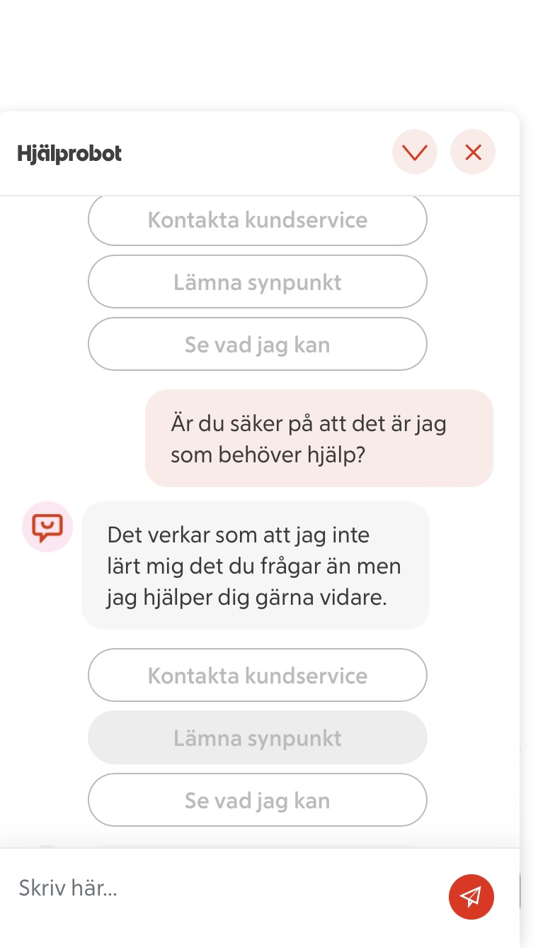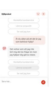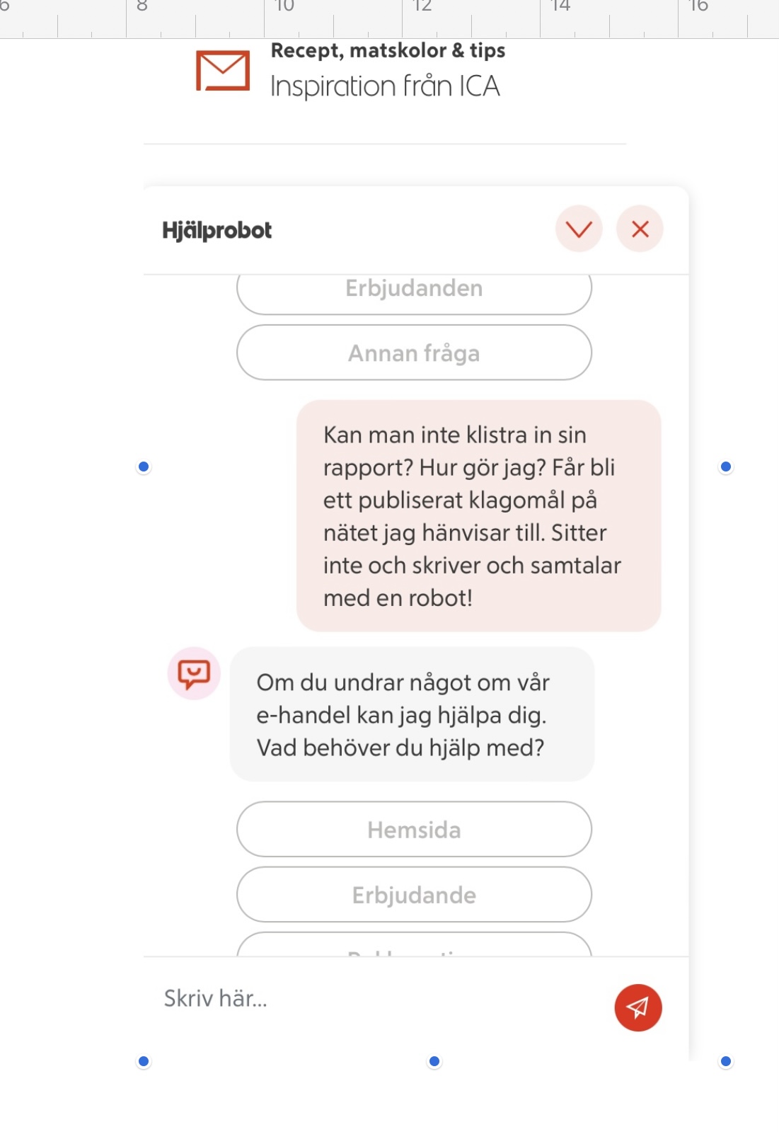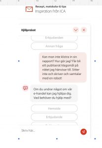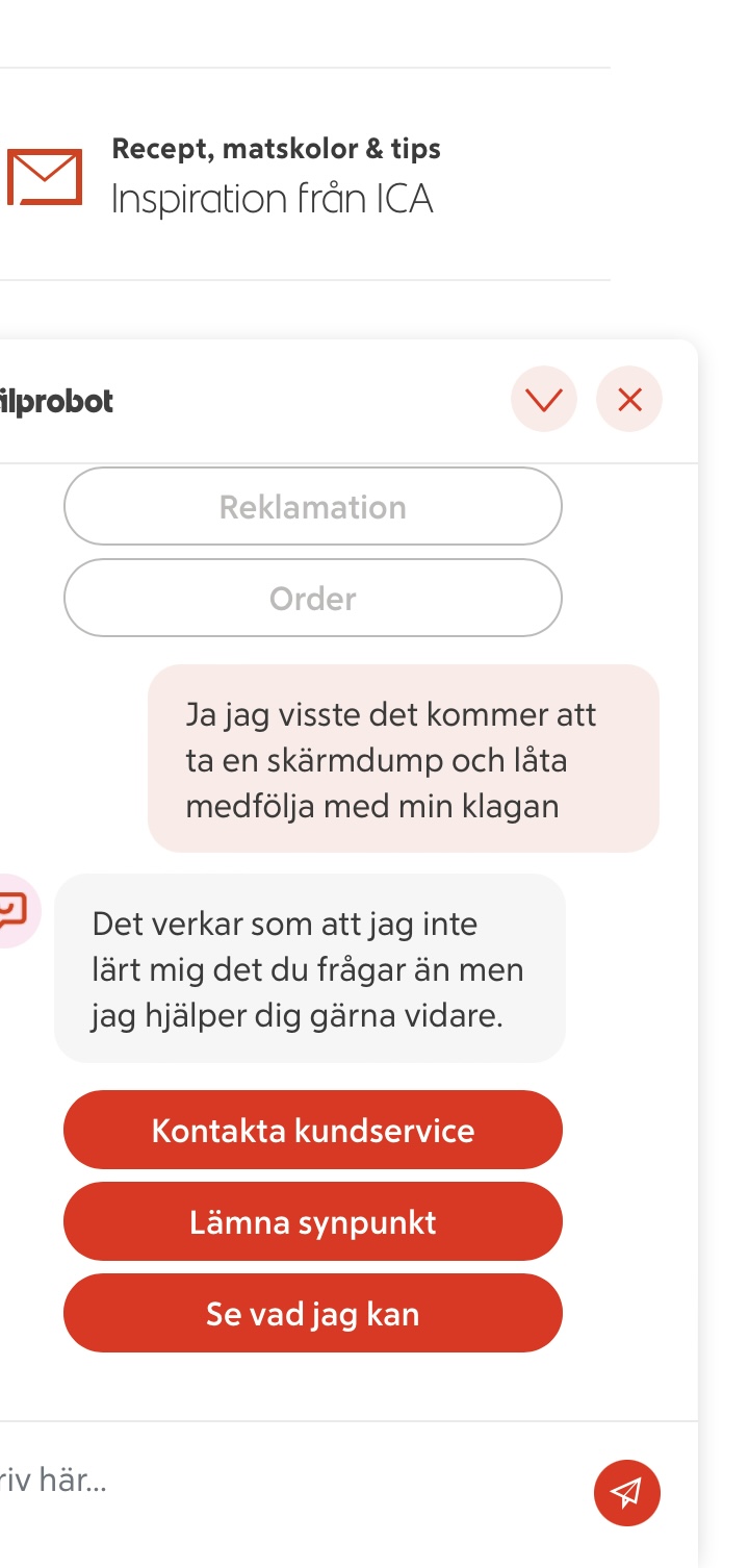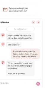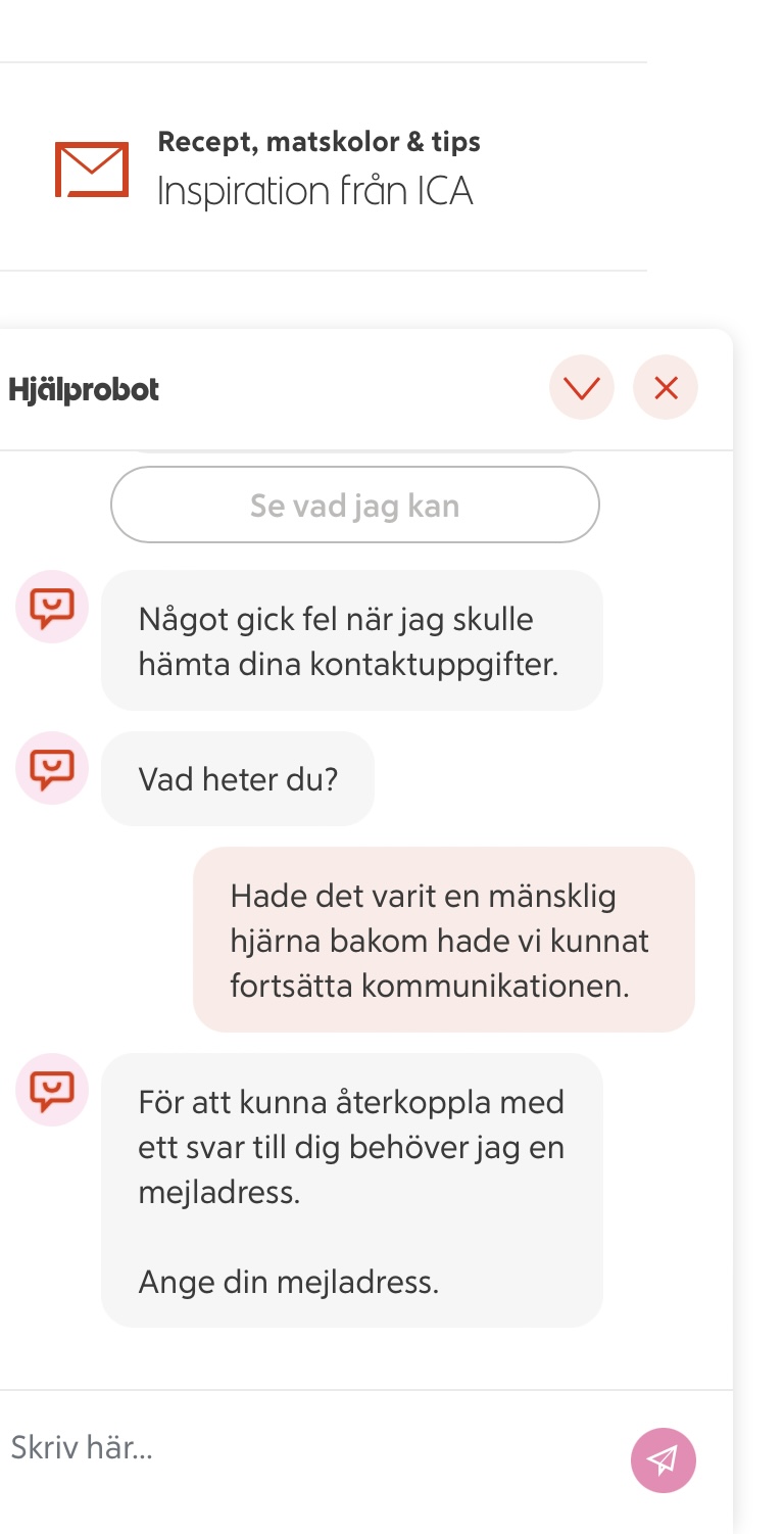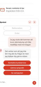 Ett snyggt hopsatt klagomål som jag var beredd att skicka till ICA. Läste på förpackningen och såg antingen kundtjänst eller ICA.se som kontakter vid eventuella frågor. Jag kopierade sidan och loggade in på ICA.se- robot som svarar på frågor, de bad om mina data trots att jag loggat in med både inloggningsuppgifter på ICA och med bank-id!   Det sägs att gamlingar inte klarar den digitala världen, kanske vi inte gör, men vad är det som är oklart??