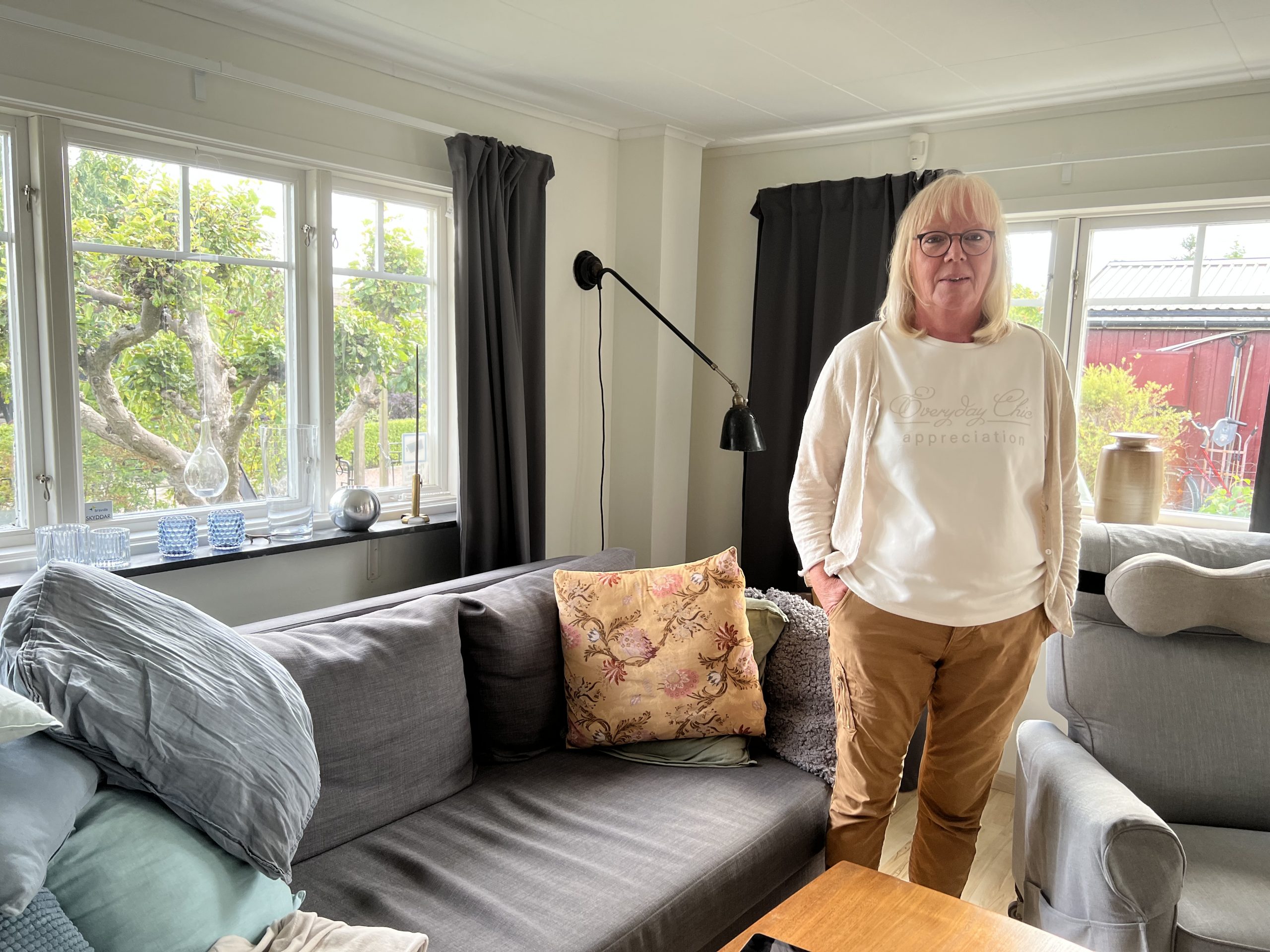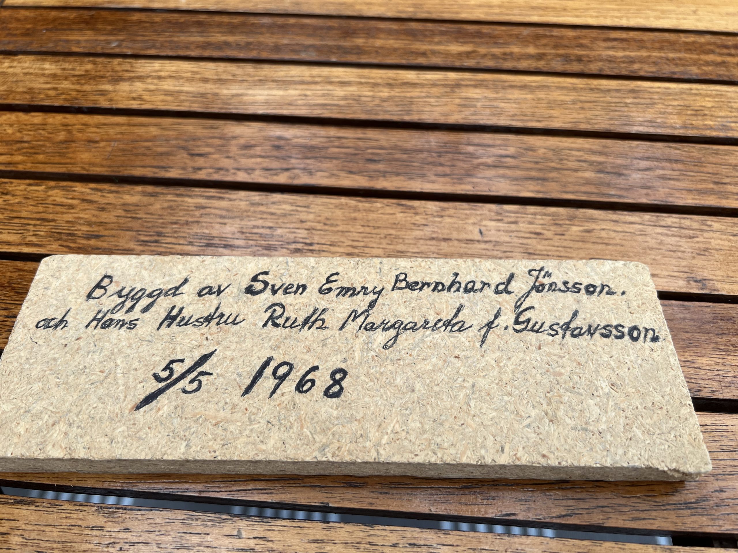 och omedelbart såg jag texten skrivet på den. Min mors välkända handstil på spånskivebiten berättade för oss; Mina föräldrars namn och när den sista stugan byggdes! Conny hade funnit det inne i en vägg när han gjorde en förändring av en vägg. Jag måste erkänna, det kändes som en kall vind som passerade i det ögonblicket, när jag såg mina mors handstil. Och jag kan föreställa mig hur högtidliga båda hade varit när de skrev och lade den i väggen. Vi fick ta några bilder både inredning och exteriör, och när jag tog en bild tillät Cecilia, också hon ägare, mig att ta en bild där hon poserar.