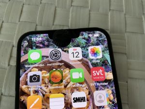 I use to copy and paste the result in a letter to them the first thing I do when we arrive home, where I am used to wifi connection and the lamplight is the right. When I placed the iPhone on kitchen table my thumb felt a kind of bump on the screen. What was it?  And under the lamp I was aware a tablet, a “Läkerol” was stuck where camera spot for Face ID is placed. When I removed that tablet everything went smoother and easier. I use to have a box with “Läkerol” in my pocket and probably my iphone had served itself with it, maybe caught an escaping  ”Läkerol”. Do you see that little black tablett just above the icon for settings?