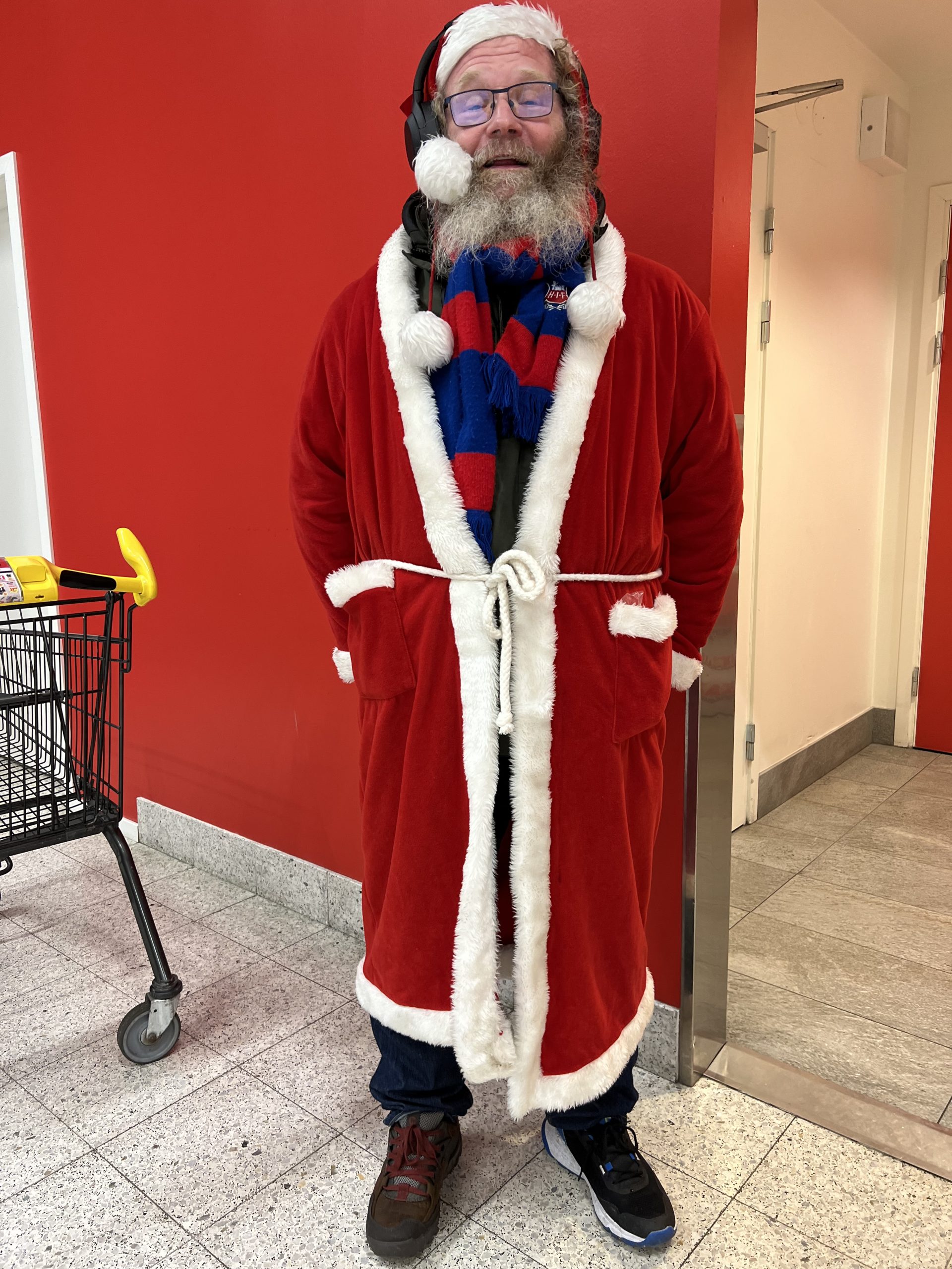 Vi anlände till vår affär och jag frågade maken om vi var mogna för en kopp kaffe, och genast höll han med. Han var absolut inte svårflirtad med kaffe. Jag går förbi toa medan du lämnar in tipset, sa jag och släntrade bort till kön vid toa. Komat hamna bakom tomten, som erbjöd mig att gå före i kön. Nog för jag vill ha en bättre julklapp! Jag svarade att yrkestrafiken går alltid före nöjestrafiken så han fick behålla sin plats i kön. Du är i tjänst verkar det, men tack i alla fall.jag har samma lön om jag sover eller är vaken. Han log och tackade. Jag tog en bild av honom och berättade att jag la ut honom på nätet.