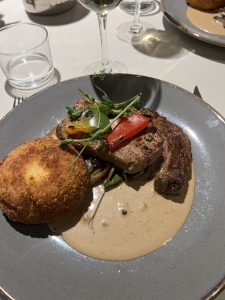 Där fanns inte några berg av grönsaker, varken färska eller ditslängda typ ärter och morötter. Nej under köttet låg där små smakliga bitar. Inga som propsade på egen uppmärksamhet. Kroketten tog över helt och vi satt och småskrattade. Aldrig att vi drömt om att en kock kunde överraska oss med sitt sätt att presentera ”pären” som min norrländske gubbe kallar dem. Jomenvisst! Vi smaskade och njöt denna sås-potatis-kombo. Köttbiten i all ära men den var bara ett tilltugg. Och tillika mör och fin, så tugg….nja. Tanken att be om påfyllning på potatisen dök aldrig upp hos någon av oss. Men efteråt, kunde vi ju bett om det och en doggybag till köttet. Kan man göra så?