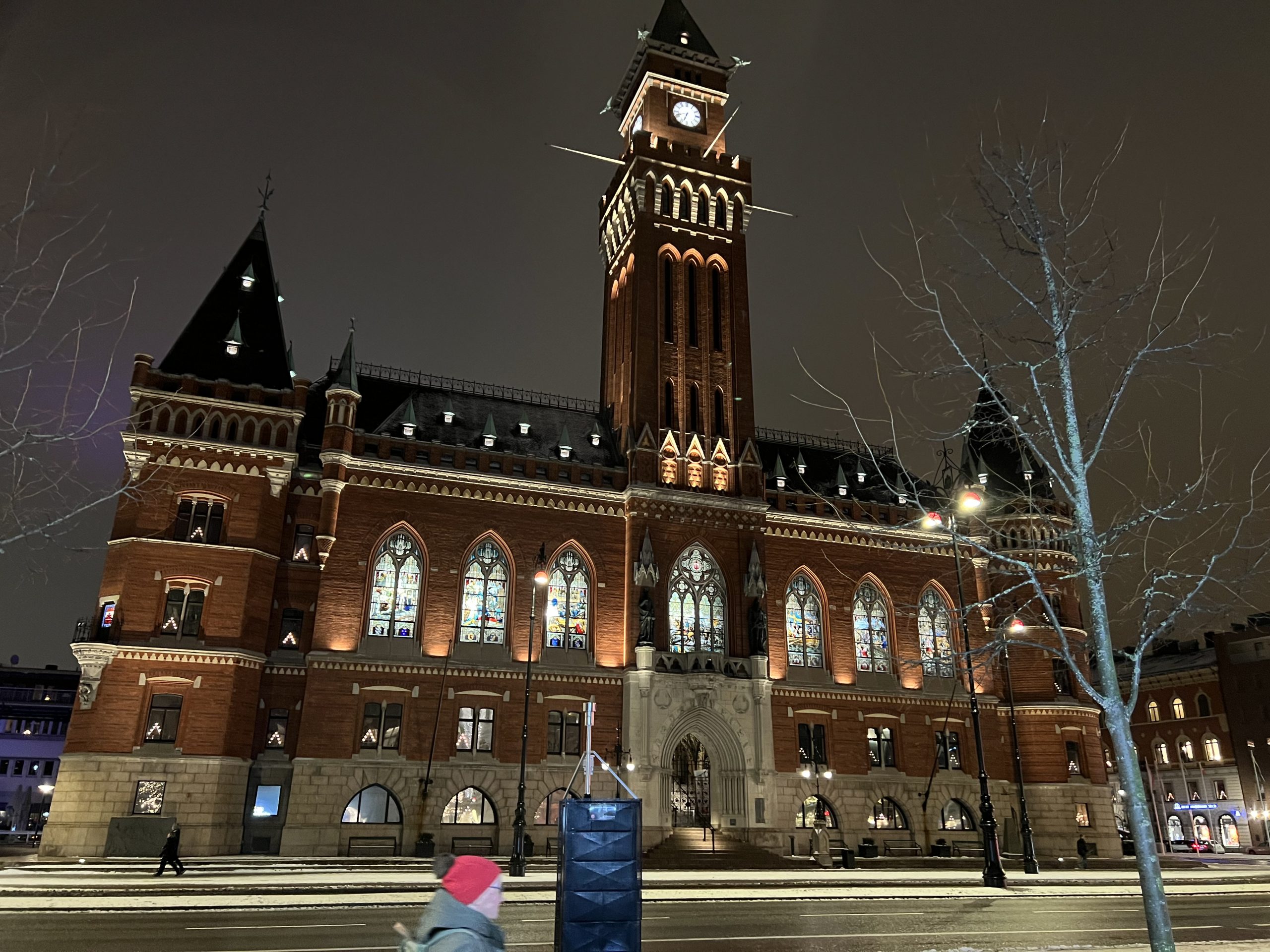 When we arrived the main street I stayed, completely captivated by the sight of our town hall. What a sight! The pompous red building were illuminated, every possible window with advent candles or other lights. Not big spots making the facade illuminated but every little window, even the small once at the roof. The front of the town hall there’s big windows with stained glass, telling the town history. I stood there overwhelmed and paralysed and admired our treasure, this beautiful house.