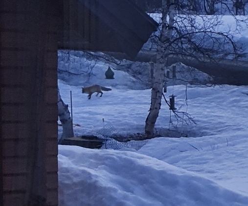 Jag fick en bild av systerdottern, en ganska mörk bild och jag undrade om hon skickade hemlig information till mig. Men efter ett tag när jag hade studerat den närmre såg jag en räv! Och jag sa till henne: det står en räv på ditt tun! Hon skrattade åt mig, hon vet om mina dåliga ögon, men höll med. Ja, det finns en räv som försöker fånga fåglarnas frö och talgbollar hon har hängt i träden i sin trädgård. Och när jag såg, kom jag ihåg alla dessa gånger vi blivit av med talgbollarna vi hängt ut för att mata fåglarna när vi tillbringade påsken i stugan. Vi hängde upp en ny boll varje dag, högre och högre men räven som bor där är en mästare att hoppa högt.